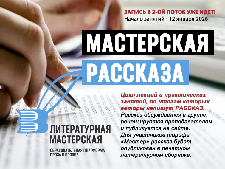 Это образовательный курс, который позволит за 12 занятий поднять ваши писательские навыки на новую высоту, позволит заглянуть «за новые горизонты» писательского мастерства, даст новые импульсы вашему творчеству, и самое главное — в процессе 12 практических занятий (каждая лекция заканчивается практическим занятием, на выполнение которого дается 1 неделя) каждый автор напишет НОВЫЙ РАССКАЗ, который может быть опубликован в наших литературных альманахах. Собственно, один лучший рассказ будет опубликован совершенно БЕСПЛАТНО (внутренний конкурс). 12 лекций (видеолекции в прямом эфире с живым чатом), 12 недель, 3 месяца — и вы можете начать новую страницу своей писательской карьеры. Возможно, вы задумаете новую книгу, новый роман и… вам удастся это сделать. Навыки, которые приобретаются на практике — очень помогают освежить писательский инструментарий, а новая практика по поиску ежедневных историй от нашего курса поможет увидеть сотни сюжетов ежедневно!В качестве преподавателей курса выступят руководитель проекта издательского сервиса «Новое слово» Максим ФЕДОСОВ, главный редактор альманаха «Театральная премьера», театральный режиссёр, художник-постановщик, Член Союза театральных деятелей РФ, Член Гильдии режиссёров РФ, мастер курса в РГИСИ Дмитрий САРВИН, редактор издательского сервиса «Новое Слово», психолог-консультант, писатель, автор литературного сборника Светлана ФИЛОНЕНКО. И главное — впервые по итогам курсов авторы напишут рассказ, который будет опубликован в одном из альманахов нашего издательства (тариф «Мастер») Два вебинара мы ждем в конце занятий от наших постоянных авторов — Дарьи ЩЕДРИНОЙ (г. Санкт-Петербург) и Романа БРЮХАНОВА (г.Хабаровск). Занятия будут проходить в он-лайне, это будут живые вебинары с возможностью задавать вопросы в чате. Записанные лекции будут храниться к специальном Личном кабинете авторов. Там же будут храниться огромное количество справочных материалов — тексты рассказов классиков (которые будем разбирать), цитатники, книги по писательскому мастерству, ссылки на фильмы (кино о писателях). Остается только открыть страницу «Мастерской рассказа» https://master.novslovo.ru, заполнить форму, выбрать тариф участия (лекции, рецензии или публикация) и начать работу с 12 января в составе группы в 20 участников. Каждому участнику открывается личный кабинет и доступ к закрытую группу, где можно будет обсуждать работы всех участников практических работ. Окончание курса планируется на 12-15 апреля, после чего каждый прошедший обучение в Мастерской рассказа получит специальный сертификат участия в Мастерской, а лучший рассказ будет опубликован бесплатно в одном из печатных альманахов в течение года.